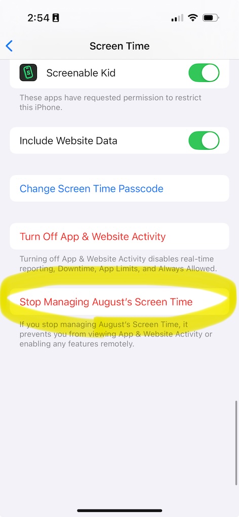 - Scroll to the bottom and tap Stop Managing [Kid]'s Screen Time, and enter your passcode to confirm.